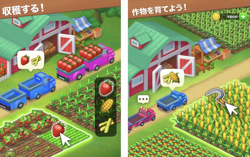 街づくりとマッチパズルが一体化したゲーム仕様で、建物を配置するだけでなく、農場でのアイテム採取や、それを使った加工品の製造・輸送といったシステムも組み込まれています。また、マッチパズルによって開拓に必要なアイテムや経験値が得られたりと、様々なゲーム要素が楽しめます。